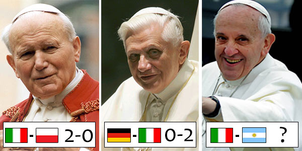 Un Papa polacco, uno tedesco e ora uno argentino. I primi due hanno "portato bene" agli azzurri nei Mondiali del 1982 e del 2006. E se il tabellone andrà come deve andare, l'Italia potrebbe affrontare l'Argentina