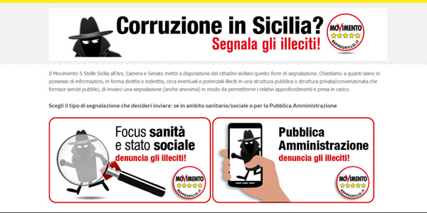Un sito online per raccogliere segnalazioni, anche anonime, su fenomeni di corruzione in Sicilia. A lanciarlo è il Movimento 5 Stelle. Da oggi i cittadini potranno utilizzare l'indirizzo www.segnalazioni5stelle.it per denunciare casi di corruzione