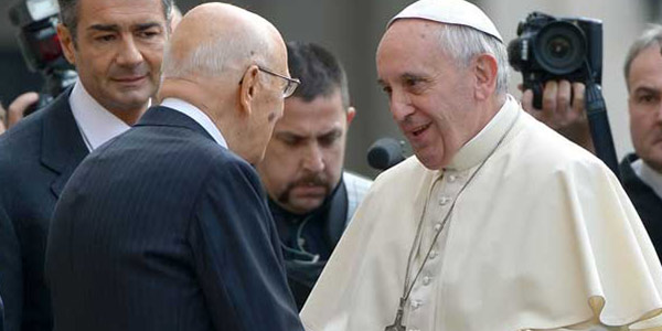 Napolitano ha lodato "il saper comunicare con i semplici, il saper trasmettere a ciascuno e a tutti i valori del messaggio cristiano" del Papa. In questo contesto arrivano con forza le parole di Bergoglio sul tema della corruzione e di chi porta una maschera che cela in realtà una “putredine verniciata”