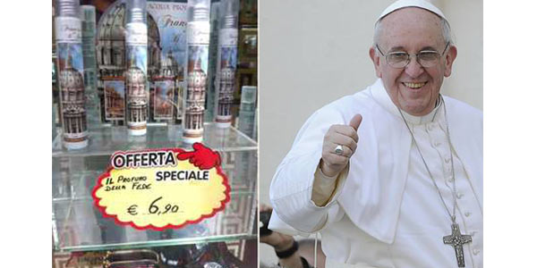 Probabilmente chi si occupa di merchandising papale non sa più cosa inventarsi per attirare clientela. L'ultima novità che si può trovare sulla bancarelle di San Pietro è "il profumo della fede", un tubetto spray con tanto di immagine della Cupola