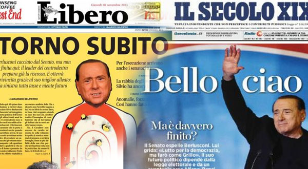Da ieri, Silvio Berlusconi, è tornato a essere un cittadino normale. Non è più un senatore e rischia persino di perdere il titolo di Cavaliere. Così, oggi, i giornali hanno trattato l'argomento sulle loro prime pagine