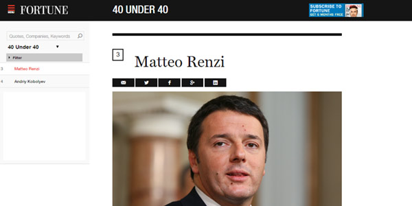 Renzi è stato definito nella breve scheda di presentazione come un "outsider carismatico" che, nonostante le difficoltà e le resistenze che sta incontrando, continua ad andare avanti nel suo programma con ottimismo