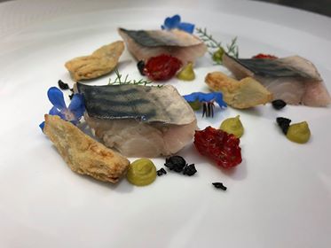 Come preparare lo sgombro in oliocottura con crema di piselli, carciofi croccanti, pomodorini confit e crumble di olive nere dello chef Marco Fusco
