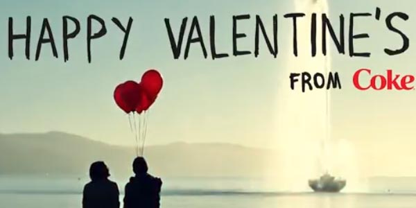 Tantissime palloncini rossi volano nell'aria legati insieme a una lattina di Coca Cola. A prenderli alcune coppie di innamorati che guardano sorridenti il cielo. Un San Valentino con le bollicine!