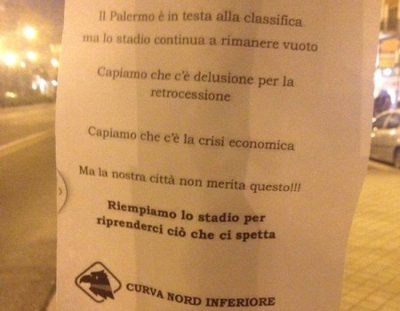 "Il Palermo è in testa alla classifica ma lo stadio continua a rimanere vuoto" si legge su decine di fogli e striscioni apparsi in giro per il capoluogo. I tifosi della Curva Nord inferiore invitano i palermitani a riempire gli spalti del Renzo Barbera