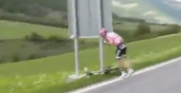 A pochi chilometri dell'ultima salita di giornata prima dell'arrivo a Bormio, la maglia rosa si è fermata a bordo strada, spogliandosi con ansia e affanno a causa di gravi problemi intestinali