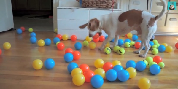 Si chiama Maymo ed è un dolce cagnolino i cui padroni, come regalo di compleanno, gli hanno regalato 100 palline per il compleanno: prima un po' di confusione, poi l'irrefrenabile gioia