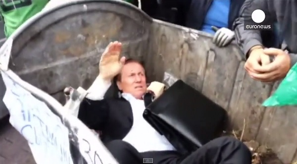Il parlamentare è stato poi trattenuto con violenza all'interno del cassonetto - come mostra il video - e gli è stato scagliato addosso uno pneumatico
